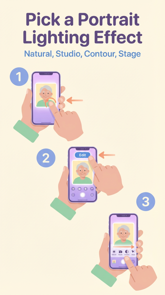 Next, touch and hold the Portrait Lighting button, then drag to select the desired lighting effect. After choosing your preferred effect, tap Done to save the changes.